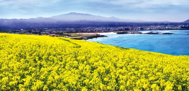 서우봉 정상에 올라가면 함덕 바다의 에메랄드빛 풍경이 한눈에 펼쳐집니다. 특히 봄이 되면 유채꽃이 피면서 제주다운 풍경을 만들어냅니다.